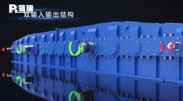 01 大型冶金起重机用一字型减速机采用双输入双输出的对称布置结构,多级传动,严格同步运行,具有防反转功能。